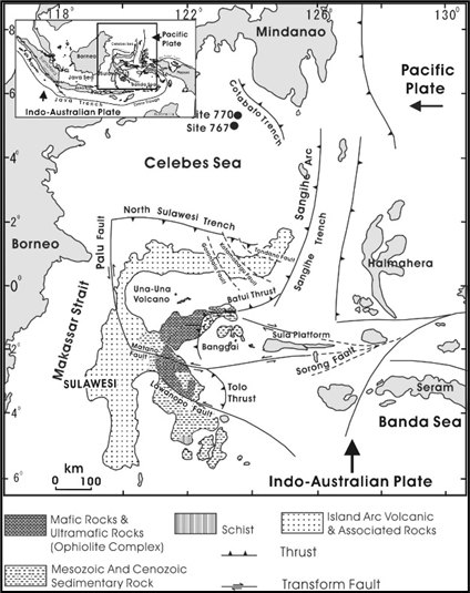 Gambar 42.3 Tektonik umum dan Peta penyebaran batuan wilayah Sulawesi (modifikasi dari Silver dkk., 1983 dalam Djajadihardja dkk., 2003).