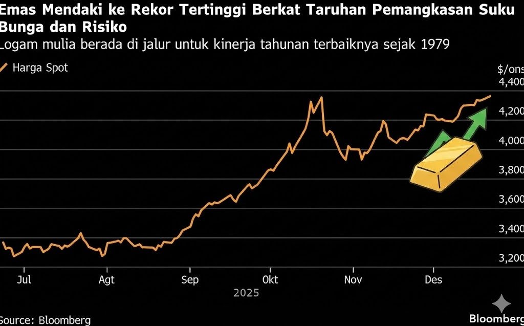 Reuters/Bloomberg — 22 Desember 2025 — Harga emas dunia mencetak rekor baru dengan menembus US$4.400/troy ons pada perdagangan Senin (22/12/2025), didorong ekspektasi lanjutan pemangkasan suku bunga The Federal Reserve serta kuatnya permintaan aset lindung nilai. Harga emas spot sempat menyentuh US$4.420/ons sebelum stabil di kisaran US$4.404–4.411/ons, naik sekitar 1,4%–1,7% dalam sehari. Secara year-to-date (YtD), emas telah melesat ±67%, menuju kenaikan tahunan terbesar sejak 1979.