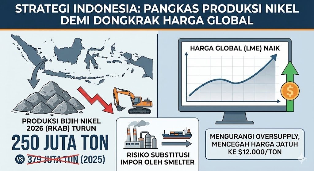 NikelID — 22 Desember 2025 — Pemerintah berencana menurunkan target produksi bijih nikel dalam RKAB 2026 menjadi 250 juta ton, turun tajam dari 379 juta ton pada 2025, sebagai upaya menahan penurunan harga akibat kelebihan pasokan.