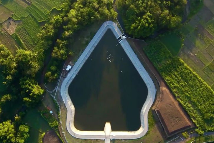 - Menggunakan drone untuk melihat bentuk embung ini yang seperti gunungan wayang dari atas.