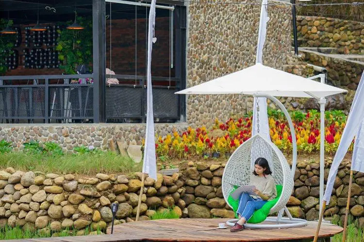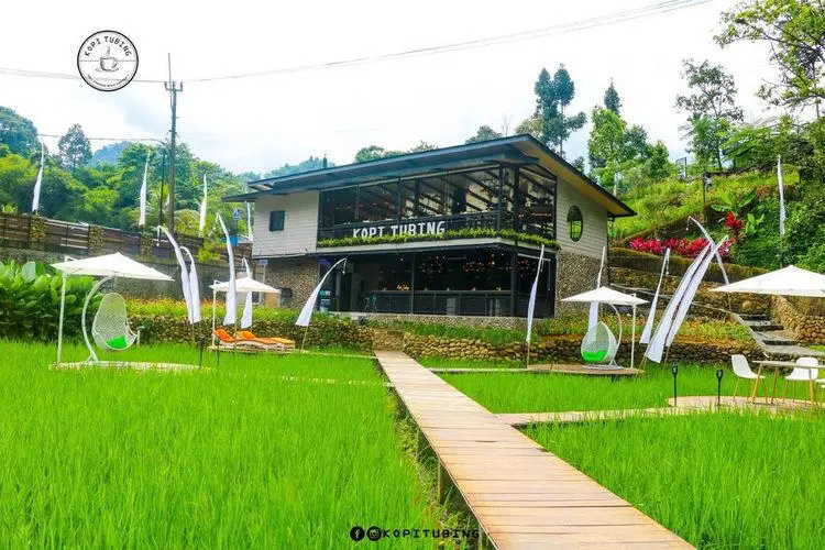 Kopi Tubing Bogor menawarkan sensasi ngopi yang unik sambil melihat pemandangan sawah dan aktivitas river tubing yang seru.