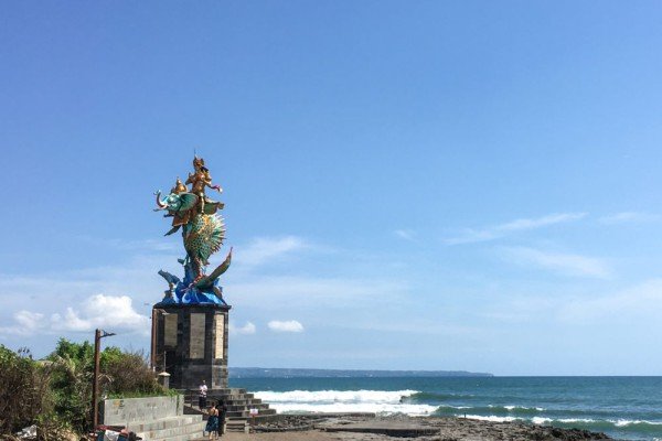 Sesampainya di tujuan, kamu akan disajikan pemandangan pantai dan lautan luas yang menawan. Di bagian bibir pantai, ada sebuah patung yang menjadi ikon pantai ini. Patung tersebut bernama Gajah Mina, yang ditunggangi oleh Dewa Baruna simbol penguasa lautan. Patung ini mempunyai tinggi sekitar 12 meter yang dibangun di atas bongkahan bebatuan karang.