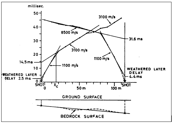 Jika jarak dari break point diketahui, maka dapat diperoleh ketebalan lapisan antara bidang refraksi, yaitu :
