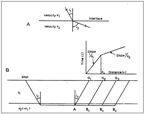 ika gelombang seismik melewati dua medium yang mempunyai kecepatan rambat yang berbeda, maka gelombang tersebut akan terbiaskan (refraksi). Jika gelombang yang datang membentuk sudut i1 dan dipantulkan dengan sudut i2 dari garis normal (Gambar 19A), maka :