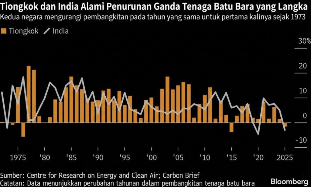 Bloomberg — 14 Januari 2026 — Sebuah fenomena langka terjadi di pasar energi global yang berpotensi mengubah peta permintaan batu bara jangka panjang. Dua konsumen terbesar dunia, China dan India, melaporkan penurunan pembangkitan listrik berbasis batu bara secara bersamaan sepanjang tahun 2025, sebuah kejadian yang pertama kali tercatat sejak embargo minyak Arab tahun 1973 atau lebih dari 50 tahun silam. Berdasarkan data Centre for Research on Energy and Clean Air (CREA), pembangkitan listrik batu bara China terkoreksi 1,6%, sementara India merosot sebesar 3%. Penurunan ganda atau double dip ini terjadi di tengah ekspansi masif energi terbarukan di China yang mampu memenuhi lonjakan konsumsi listrik, serta faktor cuaca yang lebih sejuk dan perlambatan permintaan struktural di India.