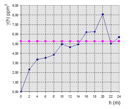 - Variogram untuk jarak pasangan h selanjutnya (2d, 3d, 4d, … dst.) lakukan kembali dengan prosedur 1 sampai dengan 3. Dengan demikian akan didapat hasil perhitungan variogram untuk setiap jarak h.